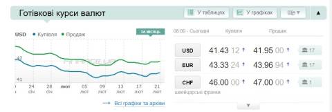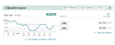 Сьогодні, 21 лютого, середній готівковий курс долара становить 41,95 гривні у продажу та 41,43 гривні в купівлі, а євро – 43,96 гривні у продажу та 43,33 гривні у купівлі.