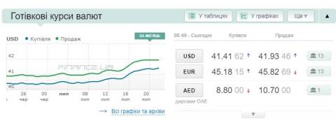 Сьогодні, 19 липня, середній готівковий курс долара становить 41,41 гривні у продажу та 41,93 гривні в купівлі, а євро – 45,82 гривні у продажу та 45,18 гривні у купівлі.