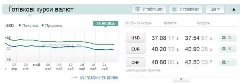 Сьогодні, 23 травня, середній готівковий курс долара становить 37,54 гривні у продажу та 37,08 гривні в купівлі, а євро – 40,90 гривні у продажу та 40,20 гривні у купівлі.