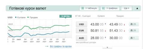 Сьогодні, 24 лютого, середній готівковий курс долара становить 43,49 гривні у продажу та 43,00 гривні в купівлі, а євро – 51,43 гривні у продажу та 50,81 гривні у купівлі.