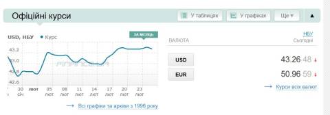 Сьогодні, 25 лютого, середній готівковий курс долара становить 43,47 гривні у продажу та 42,99 гривні в купівлі, а євро – 51,34 гривні у продажу та 50,75 гривні у купівлі.