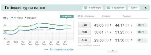 Сьогодні, 26 березня, середній готівковий курс долара становить 44,17 гривні у продажу та 43,65 гривні в купівлі, а євро – 51,23 гривні у продажу та 50,61 гривні у купівлі.