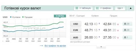 Сьогодні, 26 листопада, середній готівковий курс долара становить 42,64 гривні у продажу та 42,13 гривні в купівлі, а євро – 49,31 гривні у продажу та 48,71 гривні у купівлі.