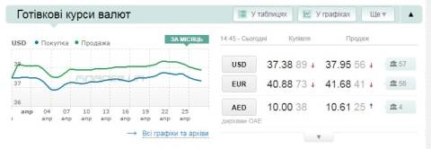 Сьогодні, 27 квітня, середній готівковий курс долара становить 37,95 гривні у продажу та 37,38 гривні в купівлі, а євро – 41,68 гривні у продажу та 40,88 гривні у купівлі.