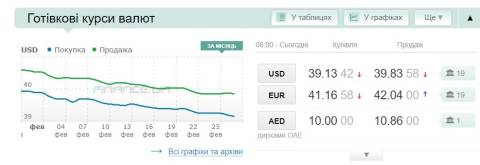 Сьогодні, 27 лютого, середній готівковий курс долара становить 39,83 гривні у продажу та 39,13 гривні в купівлі, а євро – 42,04 гривні у продажу та 41,16 гривні у купівлі.
