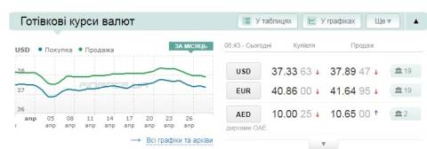 Сьогодні, 28 квітня, середній готівковий курс долара становить 37,89 гривні у продажу та 37,33 гривні в купівлі, а євро – 41,64 гривні у продажу та 40,86 гривні у купівлі.