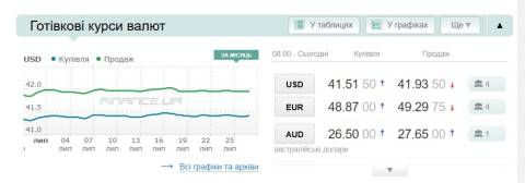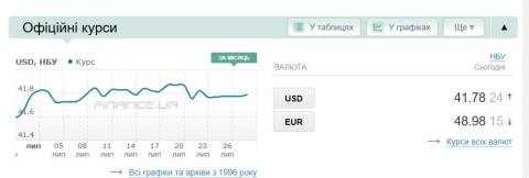 Сьогодні, 28 липня, середній готівковий курс долара становить 41,93 гривні у продажу та 41,51 гривні в купівлі, а євро – 49,29 гривні у продажу та 48,87 гривні у купівлі.