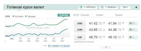 Сьогодні, 29 листопада, середній готівковий курс долара становить 41,94 гривні у продажу та 41,42 гривні в купівлі, а євро – 44,36 гривні у продажу та 43,65 гривні у купівлі.