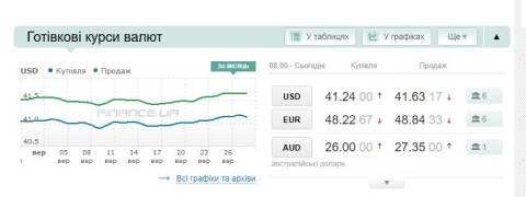 Сьогодні, 29 вересня, середній готівковий курс долара становить 41,63 гривні у продажу та 41,24 гривні в купівлі, а євро – 48,84 гривні у продажу та 48,22 гривні у купівлі.
