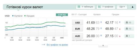 Сьогодні, 3 листопада, середній готівковий курс долара становить 42,17 гривні у продажу та 41,69 гривні в купівлі, а євро – 48,89 гривні у продажу та 48,26 гривні у купівлі.
