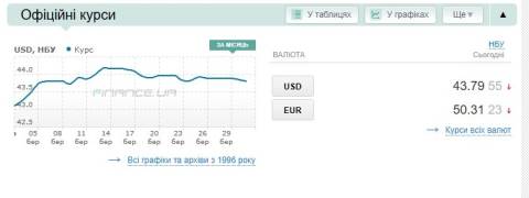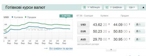 Сьогодні, 31 березня, середній готівковий курс долара становить 44,09 гривні у продажу та 43,62 гривні в купівлі, а євро – 50,83 гривні у продажу та 50,23 гривні у купівлі.