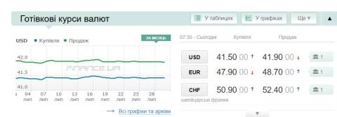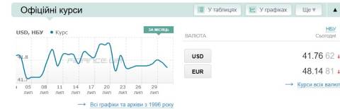 Сьогодні, 31 липня, середній готівковий курс долара становить 41,90 гривні у продажу та 41,50 гривні в купівлі, а євро – 48,70 гривні у продажу та 47,90 гривні у купівлі.