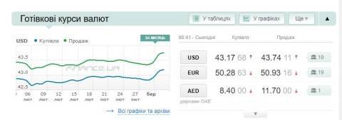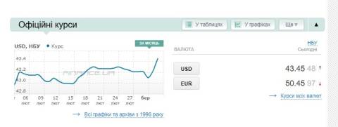 Сьогодні, 4 березня, середній готівковий курс долара становить 43,74 гривні у продажу та 43,17 гривні в купівлі, а євро – 50,93 гривні у продажу та 50,28 гривні у купівлі.