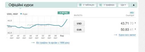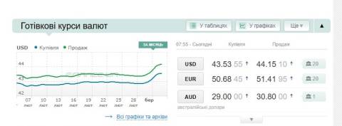 Сьогодні, 5 березня, середній готівковий курс долара становить 44,15 гривні у продажу та 43,53 гривні в купівлі, а євро – 51,41 гривні у продажу та 50,68 гривні у купівлі.