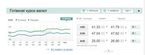 Сьогодні, 5 травня, середній готівковий курс долара становить 41,79 гривні у продажу та 41,33 гривні в купівлі, а євро – 47,62 гривні у продажу та 47,04 гривні у купівлі.