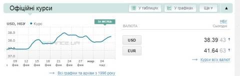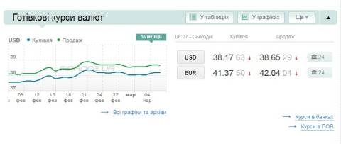 Сьогодні, 6 березня, середній готівковий курс долара становить 38,65 гривні у продажу та 38,17 гривні в купівлі, а євро – 42,04 гривні у продажу та 41,37 гривні у купівлі.