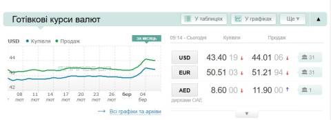 Сьогодні, 6 березня, середній готівковий курс долара становить 44,01 гривні у продажу та 43,40 гривні в купівлі, а євро – 51,21 гривні у продажу та 50,51 гривні у купівлі.