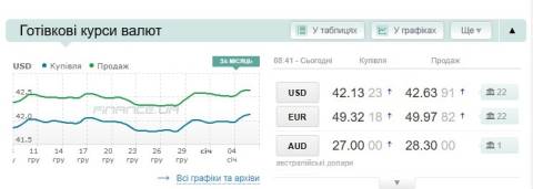 Сьогодні, 6 січня, середній готівковий курс долара становить 42,63 гривні у продажу та 42,13 гривні в купівлі, а євро – 49,97 гривні у продажу та 49,32 гривні у купівлі.
