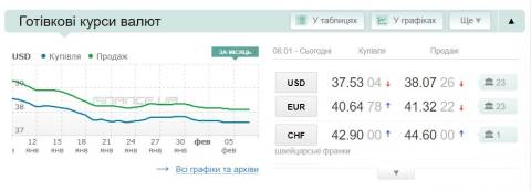 Сьогодні, 7 лютого, середній готівковий курс долара становить 38,07 гривні у продажу та 37,53 гривні в купівлі, а євро – 41,32 гривні у продажу та 40,64 гривні у купівлі.