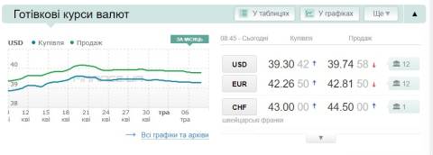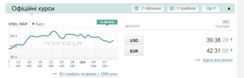 Сьогодні, 9 травня, середній готівковий курс долара становить 39,74 гривні у продажу та 39,30 гривні в купівлі, а євро – 42,81 гривні у продажу та 42,26 гривні у купівлі.