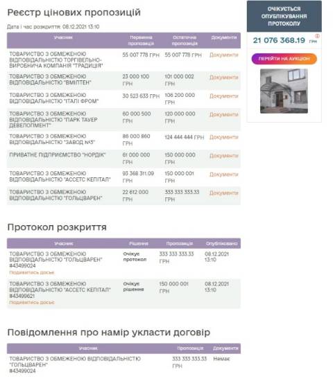 Аукціон стартував 8 грудня, участь у ньому взяли вісім компаній. Переможцем обрали ТзОВ "Гольцварен", що запропонувало найвищу ціну у 333 333 333,33 грн, а початкова вартість Вузлівського спиртзаводу становила 21 076 368,19 грн.