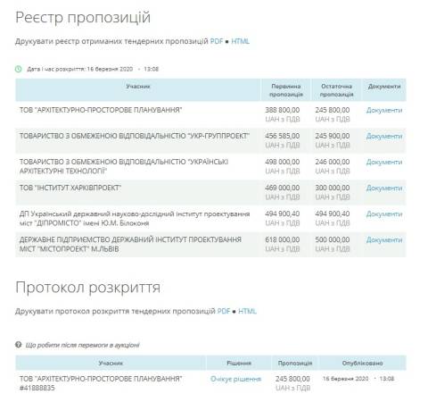 Аукціон стартував 16 березня, участь у ньому взяли шість підприємств, а переможцем обрали ТОВ "Архітектурно-просторове планування", яке запропонувало здйснили роботу за 245 800 грн. Додамо, очікувана вартість послуг становила 652 220 грн.