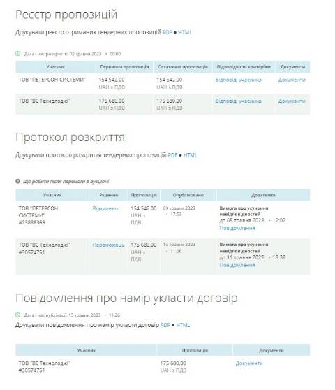 Аукціон стартував 2 травня, часть у ньому взяли дві компанії – ТОВ "Петерсон Системи" та ТОВ "ВС Технолоджі" з пропозиціями у 154 542 грн та 175 680 грн відповідно. Переможцем обрали ТОВ "ВС Технолоджі", а очікувана вартість послуг становила 199 782 грн.