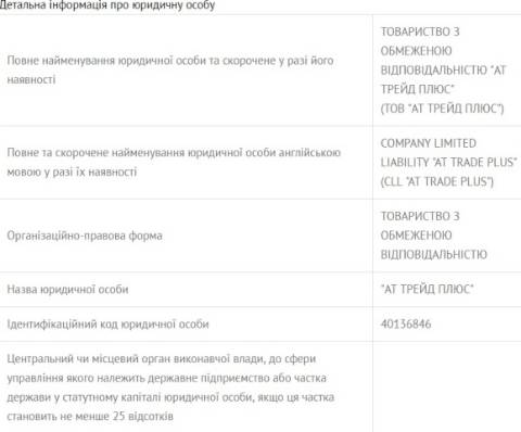 Як йдеться у єдиному державному реєстрі юридичних осіб, ТзОВ "Ат Трейд плюс" зареєстрована у Києві, займається оптовою та роздрібною торгівлею паливом, наданням в оренду власної чи орендованої нерухомості.