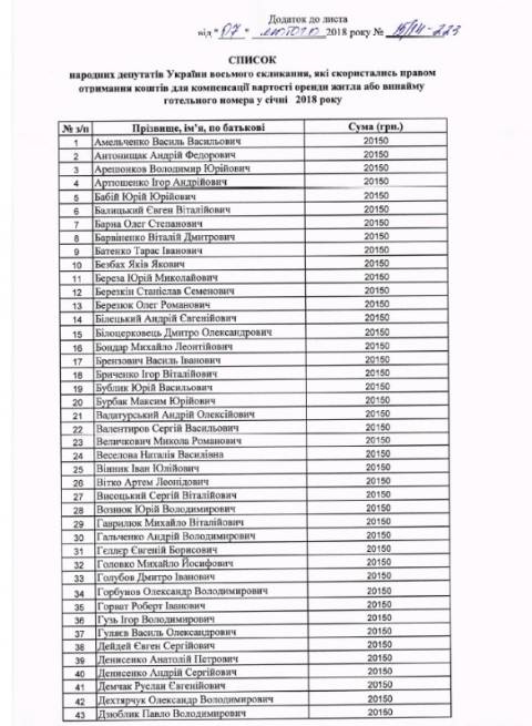 Відтак, у січні 2018 року 174 народних депутатів отримали кошти для компенсації вартості оренди житла чи готельного номера. Додамо, що у грудні 2017 року їх було 173.
