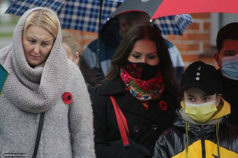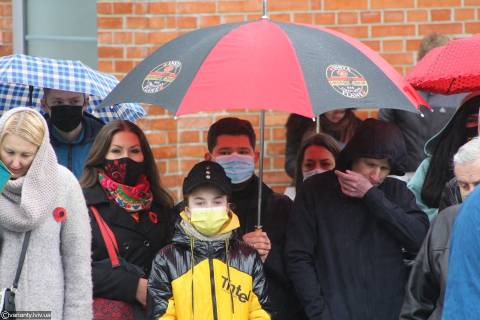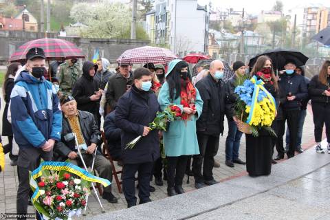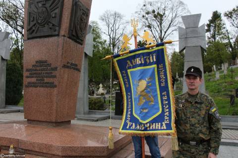 Урочисті заходи з нагоди 78-ї річниці створення дивізії "Галичина" на Личаківському цвинтарі у Львові. Присутні: заступник Голови Резерву Дивізії "Галичина" Василь Бичко, народна депутака України Софія Федина, депутати Львівської обласної ради Святослав Шеремета та Соломія Риботицька, а також громадська діячка Ірина Фаріон.