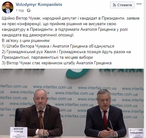 Відтак, громадянський рух "Хвиля" і партія "Громадянська позиція" йдуть разом на президентські, парламентські та місцеві вибори, а Віктор Чумак стає керівником штабу Анатолія Гриценка.