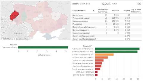 - залишки, потреби та прогноз забезпечення лікарень у обладнанні (засоби індивідуального захисту, тести, ШВЛ);