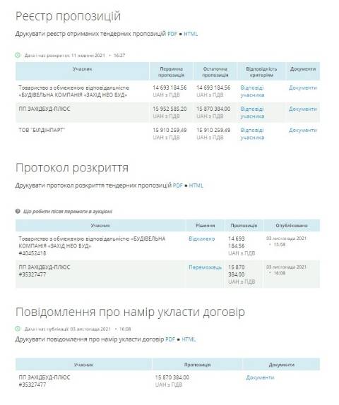 Аукціон стартував 11 жовтня, участь у ньому взяли ТзОВ "Будівельна компанія "Захід нео буд", ПП "Західбуд-плюс" та ТОВ "Білдінпарт", які запропонували здійснити благоустрій лікарні за 14 693 184,56 грн, 15 870 384 грн й 15 910 259,49 грн відповідно. Переможцем обрали ПП "Західбуд-плюс", а початкова вартість закуплі становила 16 436 278,40 грн.