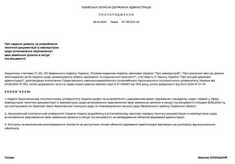 "Розглянувши клопотання Страдчівського навчально-виробничого лісокомбінату Національного лісотехнічного університету України від 23 серпня 2024 року зобов'язую надати Національному лісотехнічному університету України дозвіл на розроблення з урахуванням вимог державних стандартів, норм і правил у сфері землеустрою технічної документації із землеустрою щодо встановлення меж земельних ділянок на місцевості площею 8 246,2 га, що розташована на території Івано-Франківської селищної ради та Новояворівської міської ради Яворівського району Львівської області" – йдеться у розпорядженні.