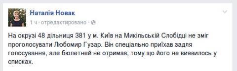 Як повідомила Новак, владика Гузар спеціально приїхав на дільницю № 381 задля голосування, але бюлетнів не отримав, тому що його не виявилось у списках".