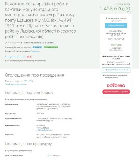 Департамент архітектури та розвитку містобудування Львівської обласної державної адміністрації оголосив закупівлю у системі ProZorro на ремонтно-реставраційні роботи пам’ятки монументального мистецтва – пам’ятника українському поету Маркіяну Шашкевичу 1911 року у селі Підлисся Золочівського району Львівської області, яку переможець тендеру має здійснити до 31 грудня 2022 року.