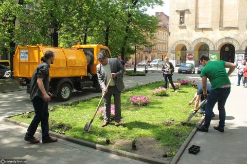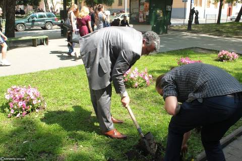 Та якщо на минулій квітопосадці домінували свободівці (Лопачак і Гутник), то тепер вся справа за укропівцями. Їм просто на гербі зеленими граблями по білому писано братись за урбан-плантації. До того ж ініціатор групового озеленення клюмби Любомир Босаневич, не вперше заквітчує Львів.