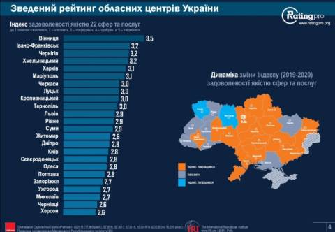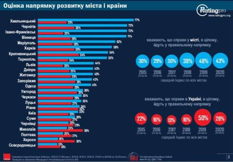 Згідно результатів опитування, 44% львів'ян вважають, що справи у місті йдуть в правильному напрямку. За цими результатами Львів опинився на 9 місці серед інших обласних центрів України. Натомість у трійку лідерів увійшли Хмельницький, Чернігів та Івано-Франківськ. Додамо, у грудні 2019 року Львів був на 8 сходинці у цьому рейтингу і 58% мешканців міста висловлювалися позитивно щодо розвитку Львова.