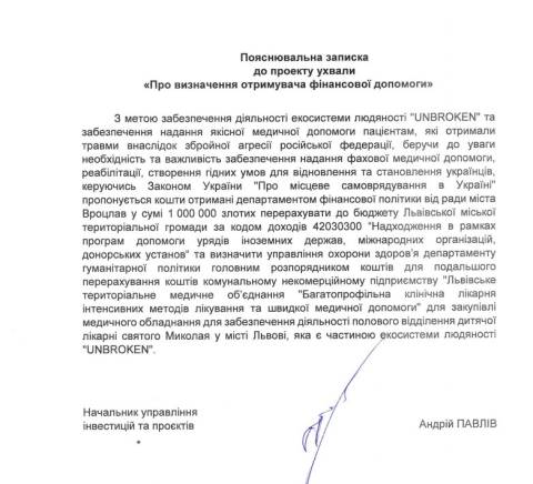 "Визначити департамент фінансової політики отримувачем фінансової допомоги від ради міста Вроцлав у сумі 1 000 000 злотих. Кошти, отримані департаментом фінансової політики перерахувати до бюджету Львівської МТГ" – йдеться в проєкті ухвали.