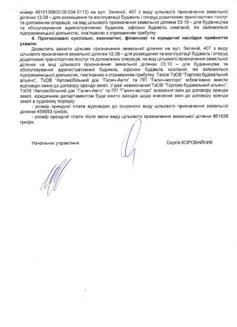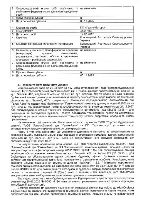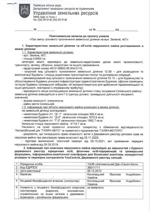 Згідно з документом, йдеться про земельну ділянку площею 0,8 га на вул. Зеленій, 407 у Сихівському районі Львова, що перебуває у комунальній власності Львова. На цій ділянці розміщені три нежитлові будівлі загальною площею 4 110,7 м² (будівля на 555,4 м², будівля на 1 872,6 м² та будівля на 1 682,7 м²), що є у приватній власності ТзОВ "Автомобільний дім "Галич авто" та ПП "Галич-моторс". Компанії орендують у міськради цю земельну ділянку з 2021 року.