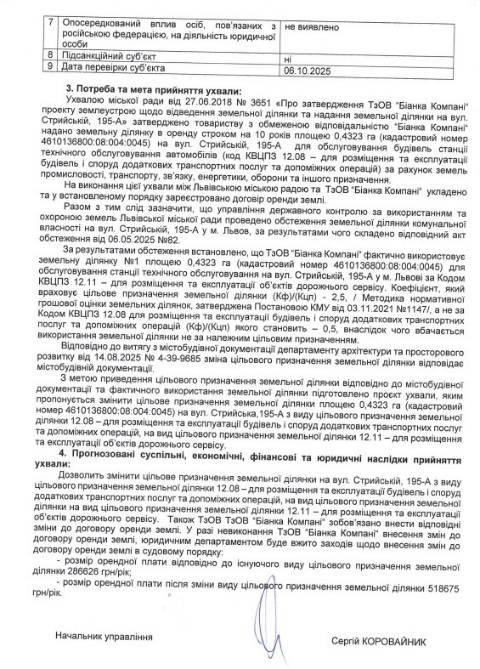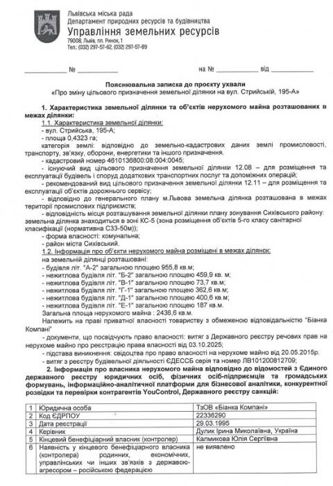 Згідно з документом, йдеться про земельну ділянку площею 0,4323 га вул. Стрийській, 195-А у Сихівському районі Львова, що перебуває у комунальній власності Львова. На цій ділянці розміщені шість нежитлових будівель загальною площею 2436,6 м² (будівля на 955,8 м², будівля на 459,9 м², будівля на 73,7 м², будівля на 362,6 м², будівля на 400,6 м² та будівля на 187 м²), що з 2015 року є у приватній власності ТзОВ "Біанка Компані". Фірма орендує у міськради цю земельну ділянку з 2018 року.