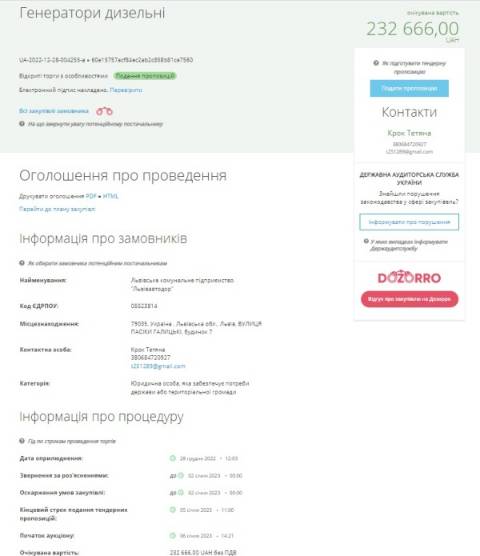 Як йдеться у закупівлі, переможець тендеру мав поставити комунальному підприємству два дизельні генератори.