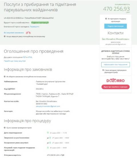 Львівське комунальне підприємство "Львівавтодор" оголосило тендер у системі ProZorro на послуги з прибирання та підмітання паркувальних майданчиків, які переможець тендеру має здійснювати до 31 грудня 2023 року.