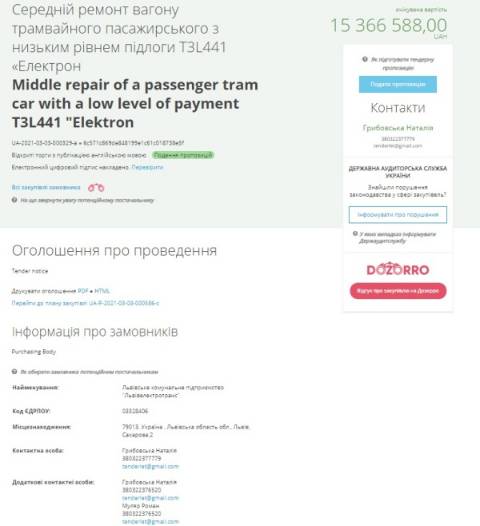 Львівське комунальне підприємство "Львівелектротранс" оголосило тендер у системі ProZorro на середній ремонт трамвайного вагону "Електрон", який переможець тендеру має поставити до 31 березня 2022 року.
