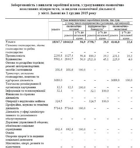 Зазначимо, порівняно із 2014 роком, заборгованість із зарплати активних підприємств зменшилася з 13,4 млн грн, а у 2013 році вона становила 23,9 млн грн.