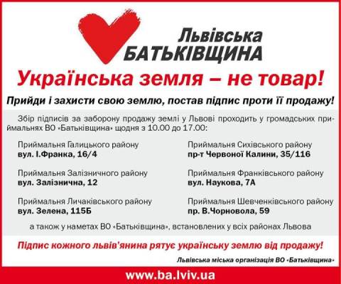 У Львові з ініціативи міської організації ВО «Батьківщина» триває збір підписів за заборону продажу української землі.