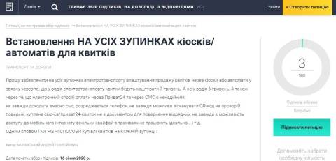 16 січня, на порталі е-петицій Андрій Моравський зареєструвув петицію з вимогою встановити на усіх зупинках кіоски або автомати для продажу квитків.