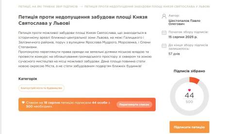 У місті зареєстрували електронну петицію проти забудови площі Князя Святослава.