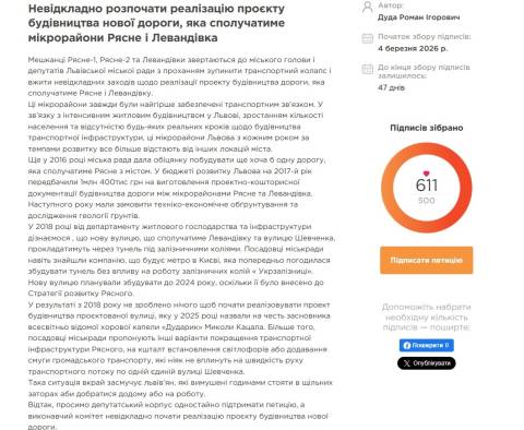 Роман Дуда 4 березня зареєстрував на порталі е-петицій Львівської міської ради петицію з проханням невідкладно розпочати реалізацію проєкту будівництва нової дороги, яка сполучатиме мікрорайони Рясне і Левандівка.