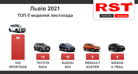 Kiaбув найпопулярнішим брендом минулого місяця. В регіоні зареєстрували 105 таких автомобілів на суму понад 2 млн доларів. Кросовер KiaSportage – найпопулярніша модель листопада, яка покрила 30% продажів. Крім Sportage часто купували Toyota RAV4 і Suzuki SX4.
